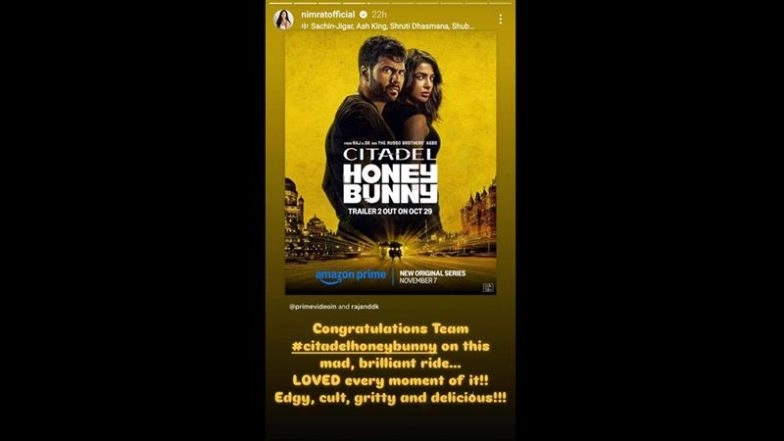 Varun Dhawan and Samantha Ruth Prabhu are gearing up for the release of their upcoming series Citadel: Honey Bunny. Directed by Raj & DK, the spy thriller series is scheduled to release on Prime Video on November 7. Ahead of its premiere, the makers of the series hosted a special screening in Mumbai on Monday, November 4. Several B-Town and TV celebrities graced the screening, including actress Nimrat Kaur. Now, an early review from the actress has arrived before the show hits the OTT platform. Taking to her Instagram handle, Nimrat Kaur showered praise on the team of Citadel: Honey Bunny. Sharing a poster of the series, she wrote, "Congratulations team #CitadelHoneyBunny on this mad, brilliant ride. Loved every moment of it! Edgy, cult, gritty and delicious!" Amid Link-Up Rumours With Abhishek Bachchan, Actress Nimrat Kaur Grabs Attention With a Hand Heart Gesture at ‘Citadel-Honey Bunny’ Premiere.