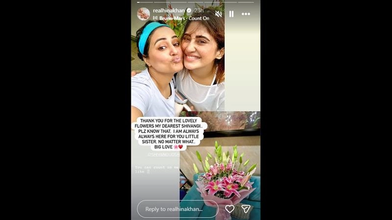 TV actress Hina Khan, who recently got married to Rocky Jaiswal, received a sweet surprise from her close friend and actress Shivangi Joshi. Taking to Instagram, Hina shared a selfie with Shivangi and a picture of the lovely bouquet she sent her. Hina wrote, “Thank you for the lovely flowers, my dearest Shivangi. Please know that I am always here for you, little sister. Big Love.” The touching post was set to Bruno Mars' song Count On. Both actresses share a deep bond and rose to fame through the popular show Yeh Rishta Kya Kehlata Hai. Hina played Akshara, while Shivangi later played Naira and Sirat. Their off-screen friendship continues to win hearts. Hina Khan Wedding Photos: 'Yeh Rishta Kya Kehlata Hai' Star Hina Khan Gets Married to Rocky Jaiswal, Actress Says, 'Our Union Is Forever Sealed in Love' (See Post)