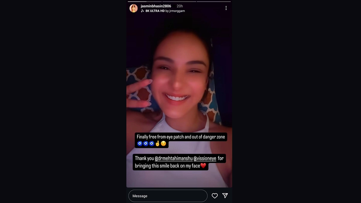 Jasmin Bhasin, who suffered corneal damage earlier this month, has finally recovered. On Saturday, she shared a health update with fans on Instagram. Posting a happy selfie, she wrote, “Finally free from the eye patch and out of the danger zone.” She thanked her doctors, adding, “Thank you for bringing this smile back to my face.” For the unversed, Jasmin was under treatment for corneal damage after wearing lenses at a Delhi event. Check out what Jasmin Bhasin posted on her Instagram feed. Jasmin Bhasin Makes First Public Appearance Following Corneal Damage, Urges Paparazzi To Refrain From Using Flash (Watch Video).