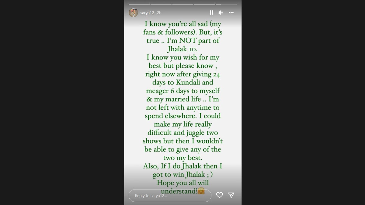 Shraddha Arya took to Instagram stories and clarified that she's 'not' doing Jhalak Dikhhla Jaa 10. In the long note, the Kundali Bhagya actress mentioned how it'll be 'really difficult' for her to 'juggle two shows'. She ended her message by saying, "also, If I do Jhalak then I got to win Jhalak."Jhalak Dikhhla Jaa 10: Urfi Javed Shines in Blue Cut-Out Dress With Mirrors at the Dance Reality Show’s Launch Event (Watch Video).