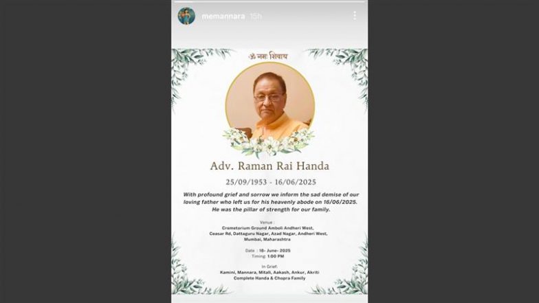 It is a difficult day for the Chopra family as Bigg Boss 17 fame Mannara Chopra's father and Priyanka Chopra's uncle, advocate Raman Rai Handa, died on Monday (June 16) in Mumbai. He was 72 at the time of his passing. Soon after the news broke out, Mannara Chopra was spotted at the airport. In a video shared by a paparazzi handle, the actress was seen walking at the airport along with her sister Mitali Handa with luggage in her hand. Visibly upset, the actress tried to reach out to someone on the phone. Earlier, she had shared the heartbreaking news of her father's passing through an Instagram story. The last rites of Raman Rai Handa will take place on June 18 at 1 PM at the Crematorium Ground in Amboli, Andheri West, Mumbai. Mannara Chopra's Father Advocate Raman Rai Handa Passes Away, Actress Says He Was the 'Pillar of Strength for Our Family'.