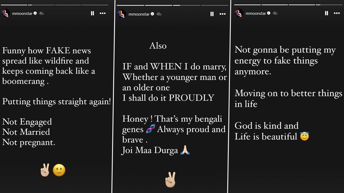 Taarak Mehta Ka Ooltah Chashmah actors Munmun Dutta and Raj Anadkat's engagement rumours have recently created a stir online. Munmun, who is 36, was reportedly linked to Raj, who played the role of Tapu and is 27 years old. But hours after the rumours went viral over the internet, both the actors took to their social media to address the ongoing news as "Fake". Two days after the whole online drama, the actress has again taken to her social media to convey her thoughts regarding the matter. In a couple of stories shared on Instagram, Munmun wrote, "Putting things straight again, not engaged, not married, not pregnant." The actress added, "Also If and When I do marry, whether a younger man or an older one, I shall do it PROUDLY". 'Fake'! TMKOC's Munmun Dutta Rubbishes Rumours of Her Engagement With Raj Anadkat.