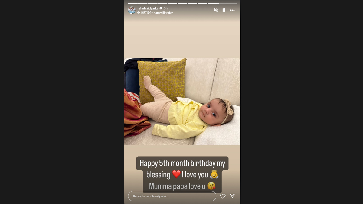 TV couple Disha Parmar and Rahul Vaidya are celebrating the fifth-month birthday of their daughter Navya. The duo shared a sweet picture of Navya on their Instagram stories to mark the milestone. Rahul expressed his love for Navya, calling her his blessing. Meanwhile, Disha observed how fast Navya grew, noting that five months had passed. The couple welcomed Navya into their lives on September 20 last year, and their joy continues to grow as they watch their little one grow. Rahul Vaidya and Disha Parmar's Munchkin Navya Looks Cute as Button in Pink-White Frock (See Pics).