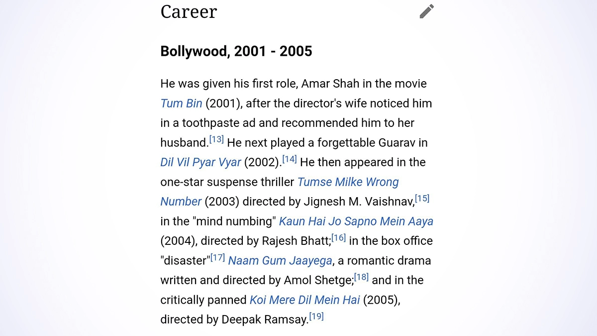Raqesh Bapat is making a lot of headlines these days, thanks to his appearance on Bigg Boss OTT and then Bigg Biss 15. However, what we noticed about the actor's Wiki page definitely needs everyone's attention. Now, as per the edited version of Raqesh's Wikipedia page's Bollywood section we see his filmy journey being tagged as a 'disaster'. That's not it, as usage of words like 'forgettable' and 'one-star', makes us wonder who hates him so much? Raqesh Bapat Romantically Lifts Ladylove Shamita Shetty in His Arms As He Wishes Her Happy Birthday (View Pics).