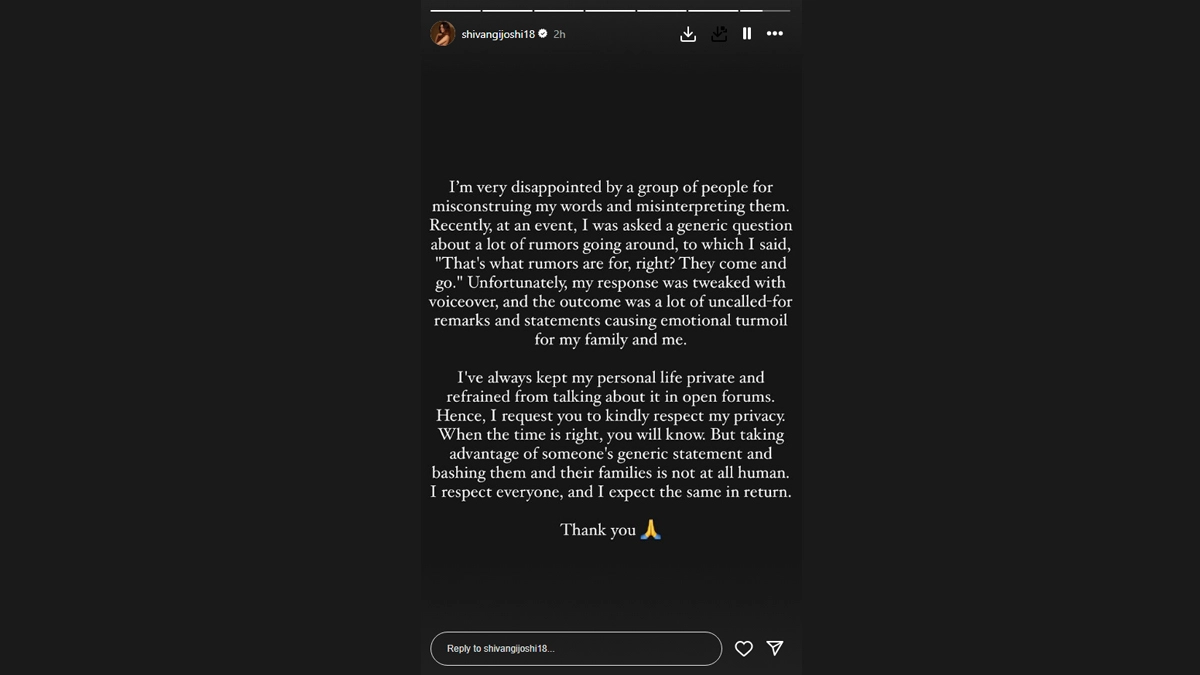 TV star Shivangi Joshi could not take it further and posted a long note on her Instagram stories expressing 'disappointment' with 'group of people'. FYI, the actress has been making news these days for her alleged affair with Kushal Tandon. In her post, she mentioned how her recent statement was misconstrued, misinterpreted and tweaked with 'voiceover', affecting her family. Joshi added that one should not take advantage of her generic statement and also urged all to respect her right to 'privacy'. Have a look. Shivangi Joshi Reacts to Rumours of Her Engagement to Barsatein Co-Star Kushal Tandon (View Post).