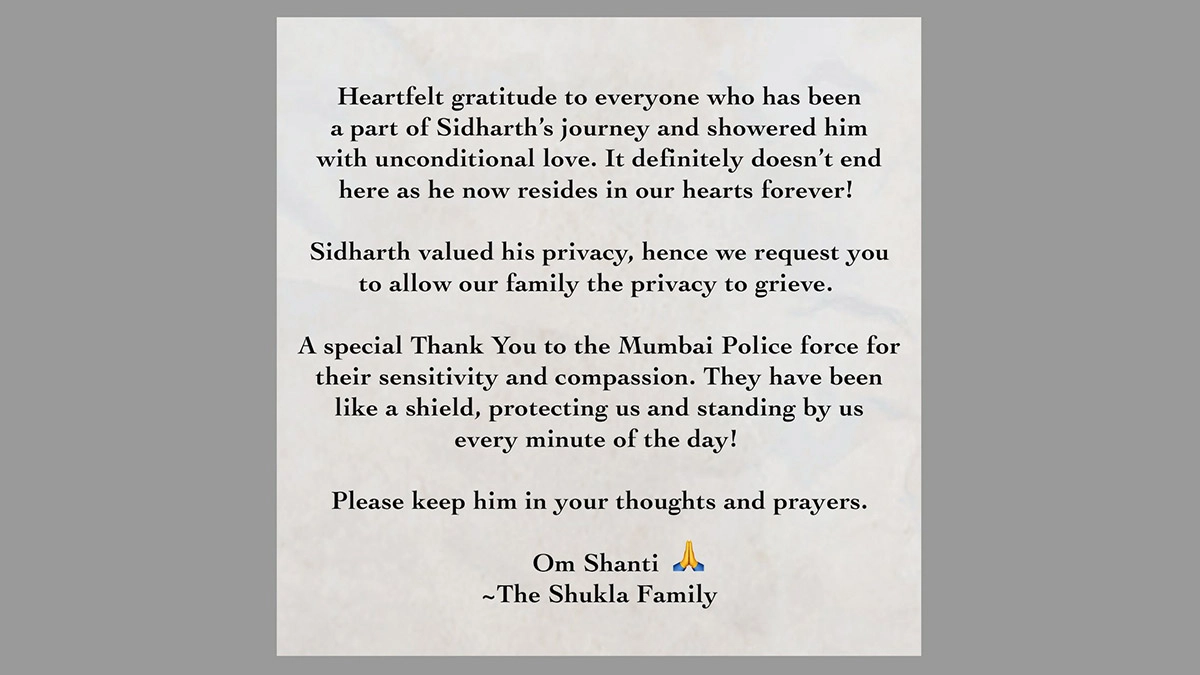 Sidharth Shukla’s untimely demise has left the industry in a state of shock and the late actor's family has recently issued a statement requesting everyone to respect their privacy to grieve. The open letter mentions a big Thank You to the Mumbai police as well. The statement read "Heartfelt gratitude to everyone who has been a part of Sidharth's journey and showered him with unconditional love. It definitely doesn't end resides in our hearts forever! here as he now Sidharth valued his privacy, hence we request you to allow our family the privacy to grieve. A special Thank You to the Mumbai Police force for their sensitivity and compassion. They have been like a shield, protecting us and standing by us every minute of the day! Please keep him in your thoughts and prayers. Om Shanti A -The Shukla Family"