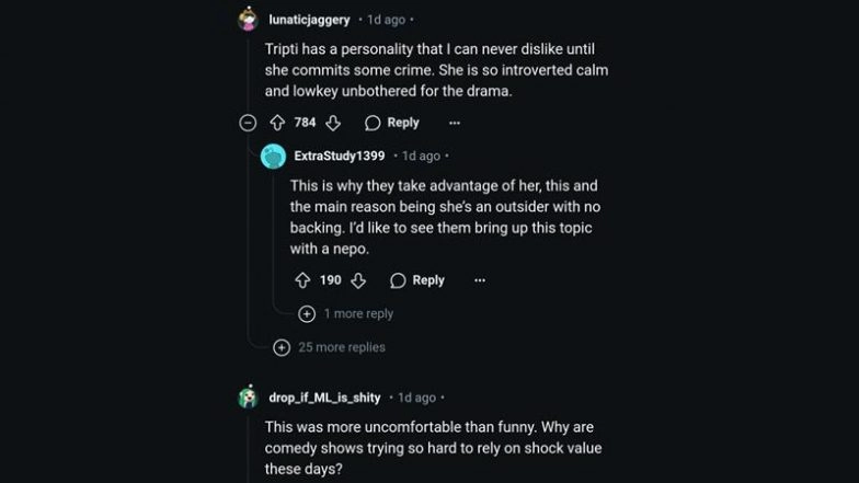 Anees Bazmee's horror franchise film Bhool Bhulaiyaa 3 was released in the theatres on Friday, November 1. The director, along with Kartik Aaryan and Triptii Dimri, recently appeared on The Great Indian Kapil Show to promote their film. Now, a short clip from the specific episode has gone viral on social media platforms featuring actor-comedian Sunil Grover playfully questioning Triptii Dimri about her bold scenes with Ranbir Kapoor in Sandeep Reddy Vanga's 2023 film Animal. The 33-second clip starts with Sunil Grover's character Dafli asking, "Aap hi haina wo jo Aminal (Animal) picture mai thi." The actress replied, "Ji mai hee thi. Dekha Maine aapne kya kya bola mere baare mein". (Yes, it was me. I heard the things you were saying about me). ( Dafli (Sunil Grover) then asks her, "Ye jo Ranbir Kapoor ke saath aapne kiya, I hope wo sirf shooting this, asli mai aisa kuch nahi tha na?" (The things you did with Ranbir Kapoor, there's nothing in real right?)The actress just laughed off the question. However, users on Reddit were not ready to take the joke lightly. One user wrote, "This was more uncomfortable than funny." While another user praised the actress and said, "This is so disgusting! She handled it so well." Check the video and netizens' reactions below. ‘Bhool Bhulaiyaa 3’ Box Office: Kartik Aaryan Netts His Highest Opening Weekend Collections With Anees Bazmee’s Horror-Comedy; Check Out His Top 5 First Weekend Grossers.