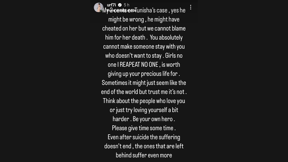 Actress Uorfi Javed reacted to Tunisha Sharma's suicide case recently, she took to Instagram and took Sheezan Khan's side by saying he is not at fault in the actress' death. The actress ended her story by saying "Even after suicide the suffering doesn't end." Kangana Ranaut Reacts to Tunisha Sharma’s Suicide, Says ‘Please Know She Didn’t Do It Alone, It’s a Murder’.