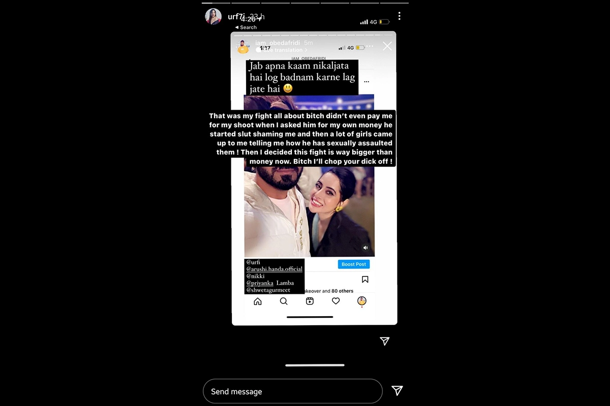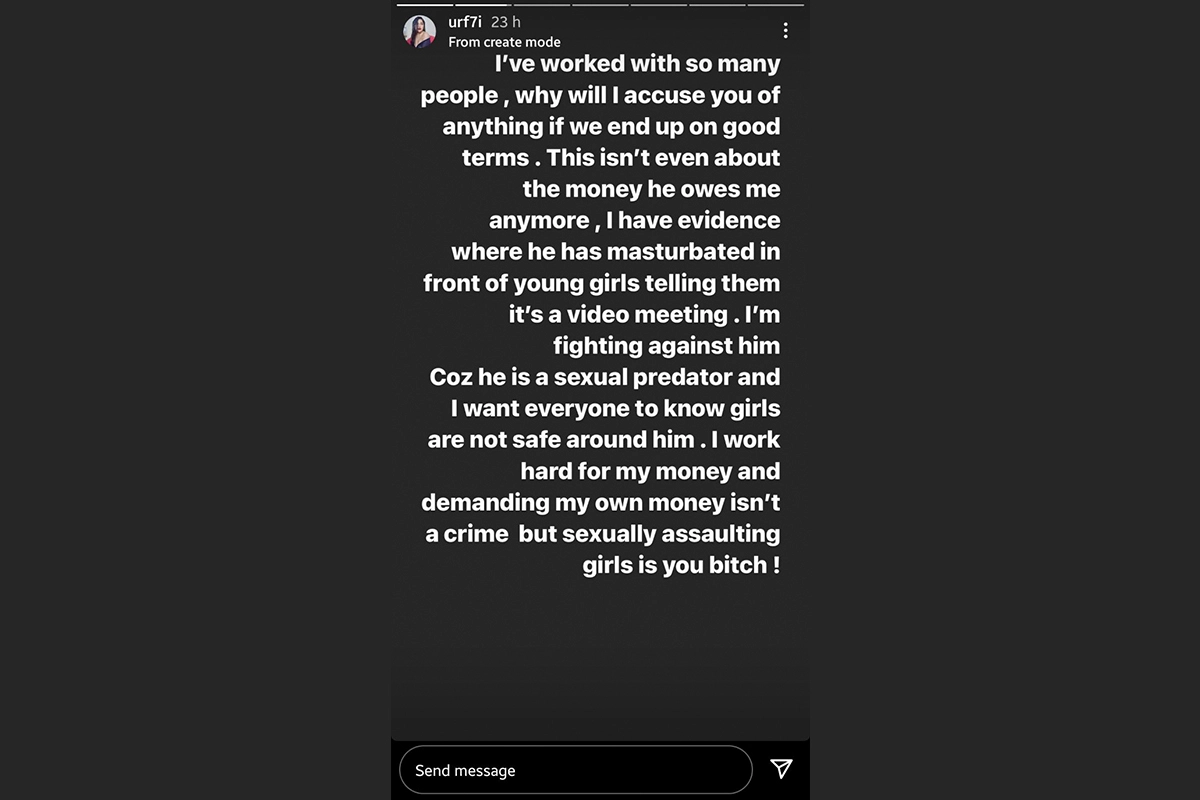 In one of her story Urfi wrote, "I've worked with so many people , why will I accuse you of anything if we end up on good terms. This isn't even about the money he owes me anymore , I have evidence where he has masturbated in front of young girls telling them it's a video meeting. I'm fighting against him Coz he is a sexual predator and I want everyone to know girls are not safe around him.I work hard for my money and demanding my own money isn't a crime but sexually assaulting girls is you bitch!"