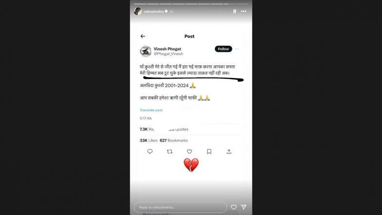 In a heart-wrenching turn of events, ace Indian wrestler Vinesh Phogat announced her retirement from the sport just a day after her disqualification from the 2024 Paris Olympics. Phogat, a three-time Olympian, had reached the women's 50 kg category final but was later disqualified for being 100 grams overweight. Phogat's emotional post announcing her retirement has left many heartbroken, including TV actor Nakuul Mehta. Taking to his Instagram handle, the Bade Acche Lagte Hain actor re-shared Phogat's tweet and reacted with a broken heart emoji. His reaction resonates with many Indians, highlighting just how significant the sport is to her. Vinesh Phogat Retires: India’s Star Grappler Announces Retirement From Wrestling After Being Disqualified From Women’s 50 Kg Final at Paris Olympics 2024, Writes ‘I Don’t Have Any More Strength’.