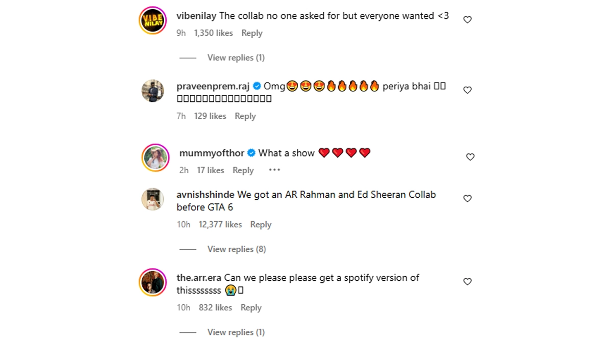 Ed Sheeran’s Chennai concert on February 5 at the KM College of Music & Technology, part of his multi-city India tour, delivered a truly unforgettable moment for fans. Attendees were treated to a surprise collaboration no one anticipated – Indian musical legend, AR Rahman, joined Sheeran on stage! The two artists performed a unique mashup of Sheeran’s hit “Shape of You” and Rahman’s iconic “Urvasi”. Sheeran shared a short video clip of the performance on his Instagram, capturing the electric atmosphere as fans went wild, cheering and whistling as Rahman was introduced. The comments section exploded with excitement such as, “What a show”, “collab!”, “I WAS THEREE OMGGG LEGENDARY” and so on. Ed Sheeran Visits AR Rahman’s Studio Ahead of his Chennai Concert, Captures Special Moment – See Pics!