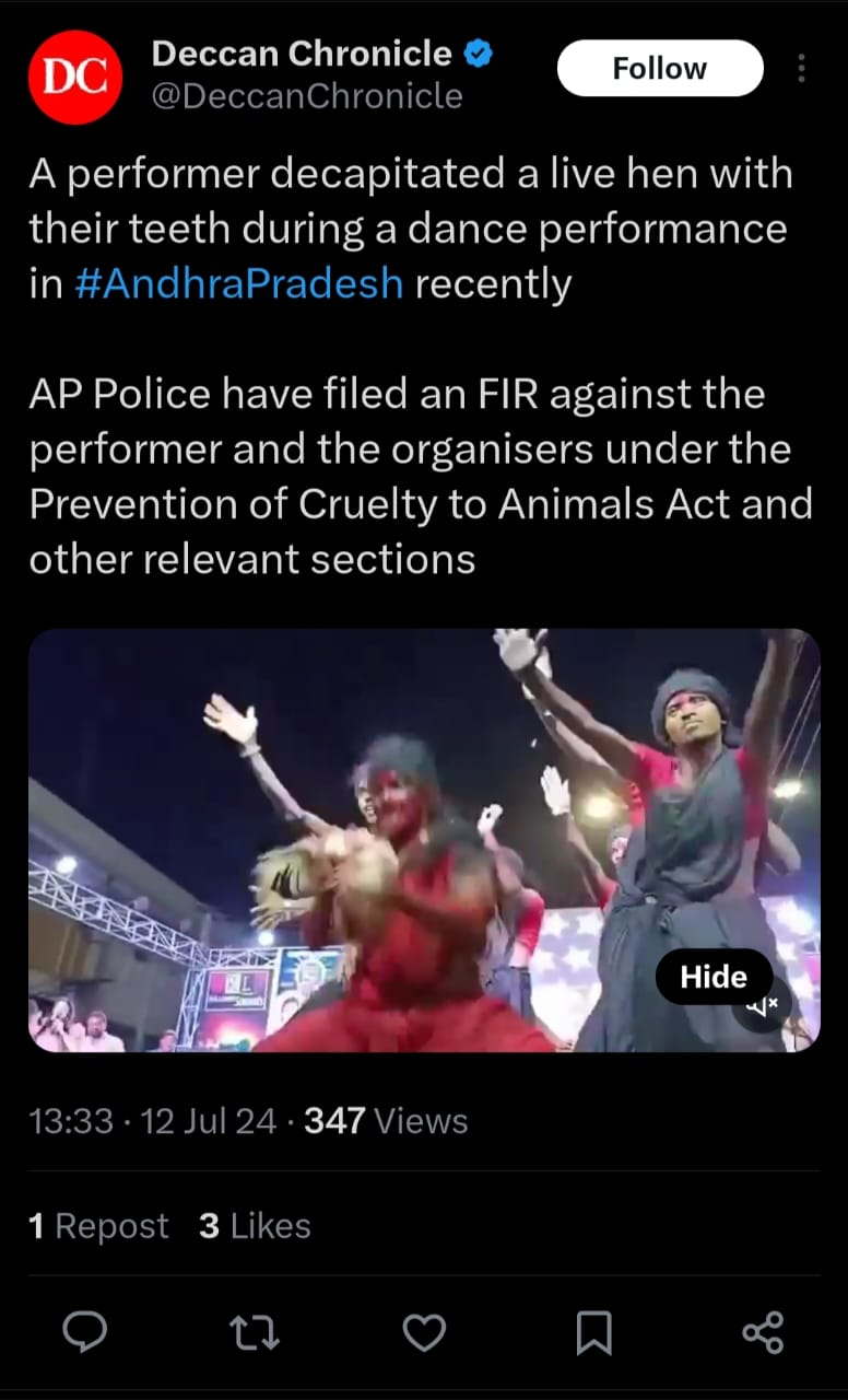 In a disturbing incident, a performer decapitated a live hen with his teeth during a dance performance in Andhra Pradesh. The shocking act was captured on video and quickly went viral, prompting widespread outrage. Authorities have registered an FIR against the performer following the incident. The video, which has been circulating on social media, shows the performer engaging in the gruesome act as part of her routine. Andhra Pradesh Shocker: Butcher Stabs Pregnant Stray Dog to Death in Guntur, Case of Animal Cruelty Registered Against Accused.