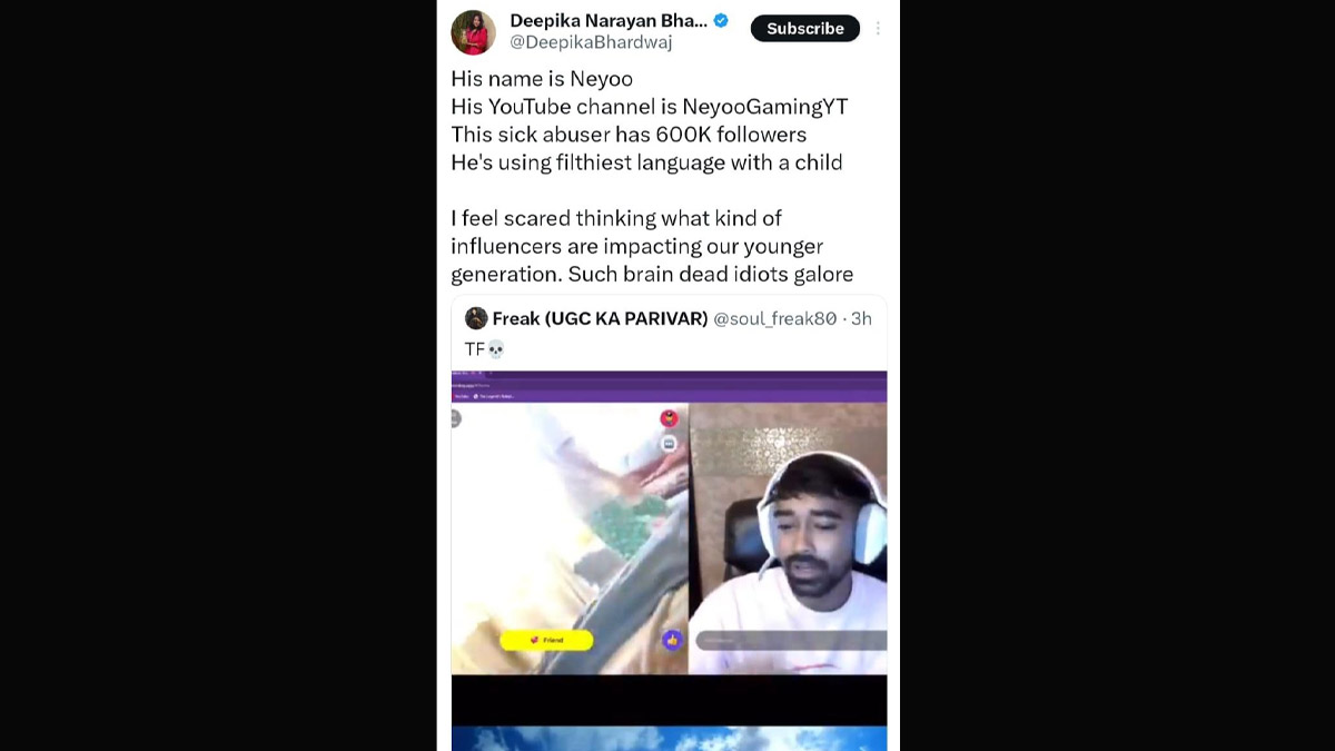 A video going viral on social media shows a gamer and YouTuber named Neyoo, aka Suraj Majumdar, allegedly hurling abuse and using filthy language with an underage girl. The viral clip shows Suraj Majumdar allegedly hurling abuse at the underage girl and even going on to use filthy language while conversing with her on a livestream video. Suraj has a channel on YouTube named "NeyooGamingYT" with over 600 thousand followers. Soon after the clip went viral on social media, Neyoo, aka Suraj Majumdar, apologised after netizens called out his behaviour.