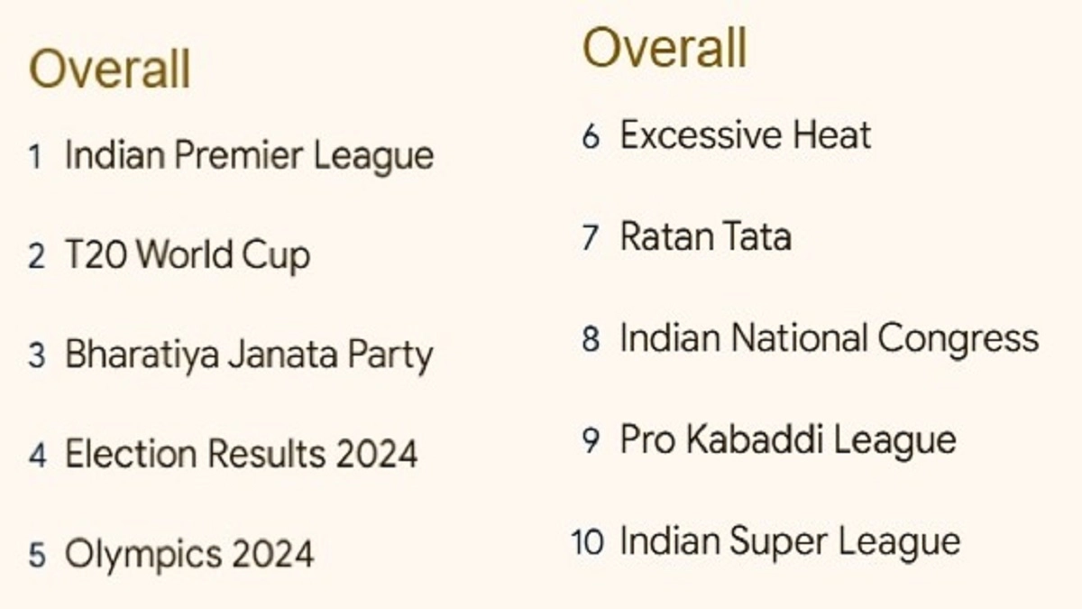Today, December 10, Google shared the most searched topics that people looked for on Google Search in India this year. In the overall category, Indian Premier League, T20 World Cup, Bharatiya Janata Party, Election Results 2024 and Olympics 2024 were in the top 5 search list, while Excessive Heat, Ratan Tata, Indian National Congress, Pro Kabaddi League and Indian Super League made it to to the Top 10 search list under the overall category. Under movies, people across the country searched for Stree 2, Kalki 2898 AD, 12th Fail, Laapataa Ladies and Hanu-Man among others.