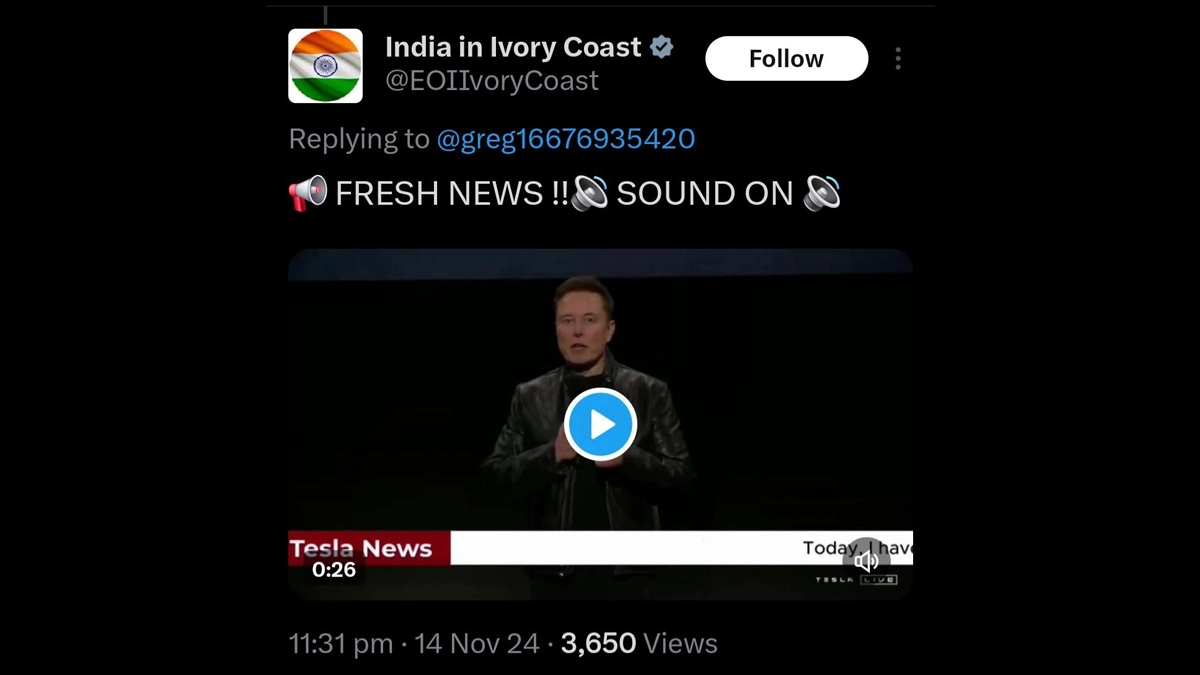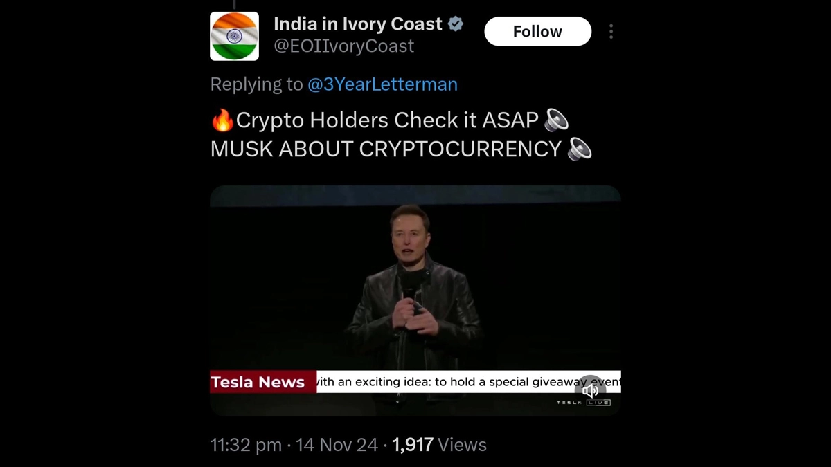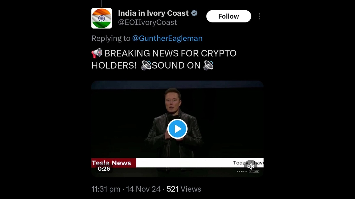 Was the official X account of the Embassy of India in Ivory Coast hacked? Cryptocurrency-related posts featuring billionaire Elon Musk appeared on the official X account of the Embassy of India in Ivory Coast (India in Ivory Coast/@EOIIvoryCoast) late on Thursday, November 14. The now-deleted posts had videos of Elon Musk with sound bytes promoting cryptocurrency. There is no official confirmation if the "India in Ivory Coast" (@EOIIvoryCoast) X account was hacked so far. Kailash Vijayvargiya X Account Hacked? Viral Image Shows ‘This Is Hacked Account’ Post Written on Madhya Pradesh Minister’s Twitter Account.