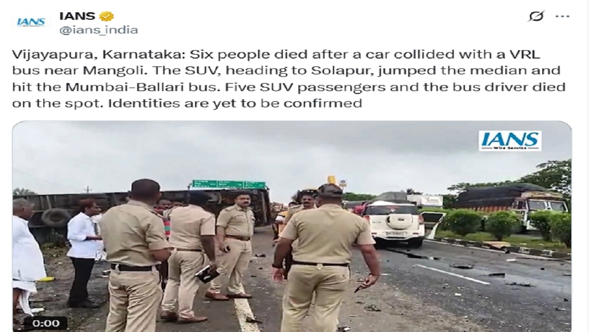 In an unfortunate incident in Karnataka, six people died in an accident in Vijayapura. According to the news agency IANS, six people were killed after a car collided with a VRL bus near Mangoli. It is reported that the SUV, which was heading to Solapur, jumped the median and hit the Mumbai-Ballari bus. Officials said that five passengers of the SUV and the bus driver died on the spot. The identities of the deceased are yet to be confirmed. A disturbing video of the accident has also surfaced online. Kalaburagi Road Accident: 5 Killed, Several Others Injured After Mini Bus Rams Into Parked Truck in Karnataka (See Pics).