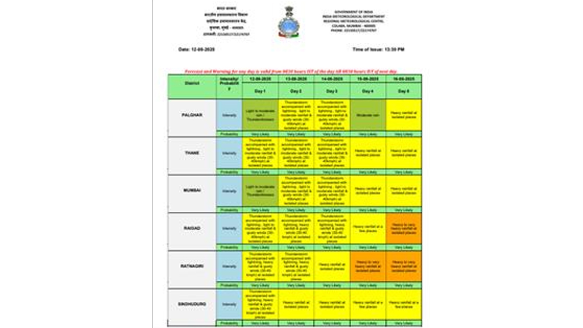 The India Meteorological Department (IMD) has issued a yellow alert for several districts of Maharashtra, including Mumbai, Thane, and Palghar. The weather agency has also issued a yellow alert for Raigad, Ratnagiri, Sindhudurg, Ahilyanagar, Pune, Satara, Sholapur, Jalna, Parbhani, Beed, Hingoli, Nanded, Latur, Dharashiv, Akola, and Amaravati, among other places. IMD has forecast thunderstorms accompanied by lightning, light to moderate rainfall and gusty winds at isolated places in the districts mentioned above. Click here to view the weather forecast for several districts of Maharashtra for August 13. Uttarakhand Weather Forecast: IMD Issues Red, Orange and Yellow Alerts Across State for Coming Week, Warns of Heavy to Very Heavy Rainfall.