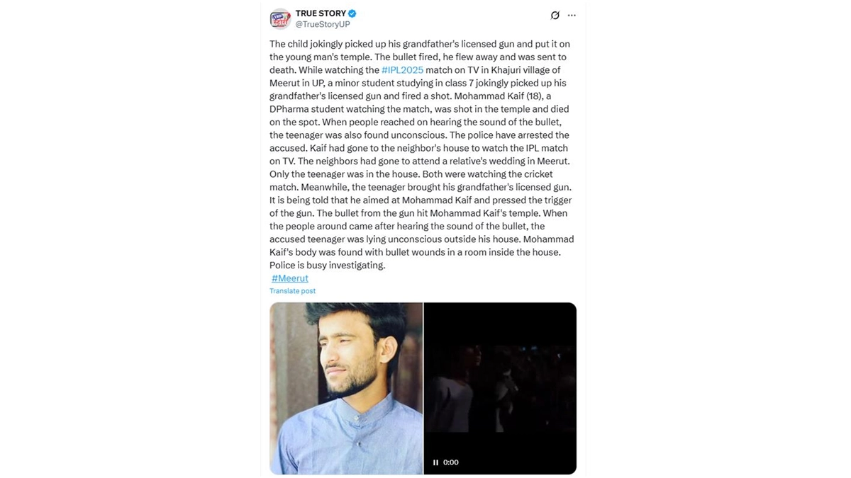 In a tragic incident in Khajuri village, Meerut, a minor boy accidentally shot his 18-year-old neighbor, Mohammad Kaif, while playing with his grandfather's licensed gun. The boy, studying in Class 7, jokingly aimed the gun at Kaif’s temple while they were watching an IPL match. The bullet fired, striking Kaif in the temple, leading to his immediate death. The boy was later found unconscious outside his house. Police have arrested the minor, and investigations are ongoing. Meerut Shocker: Woman Kills Husband in Uttar Pradesh’s Indiranagar, Seals Body in Cement-Filled Drum.