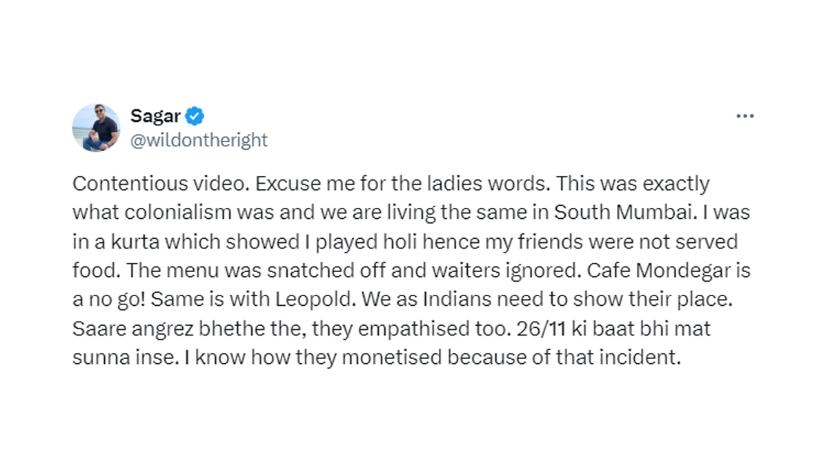 A video going viral on social media shows a popular eatery in Mumbai allegedly refusing to serve food to a man and his friends who visited the restaurant after playing Holi. The man, a photographer identified as Sagar Damle, took to X, formerly Twitter and said that he and his friend who were wearing colour-stained clothes visited Cafe Mondegar after playing Holi. However, he claimed that the eatery refused to serve them food. "I was in a kurta which showed I played holi hence my friends were not served food. The menu was snatched off and waiters ignored. Cafe Mondegar is a no go!," Damle said. He also shared a video of the alleged incident where he is seen arguing with the popular eatery's staff after being denied food. Later, he deleted his post on X.