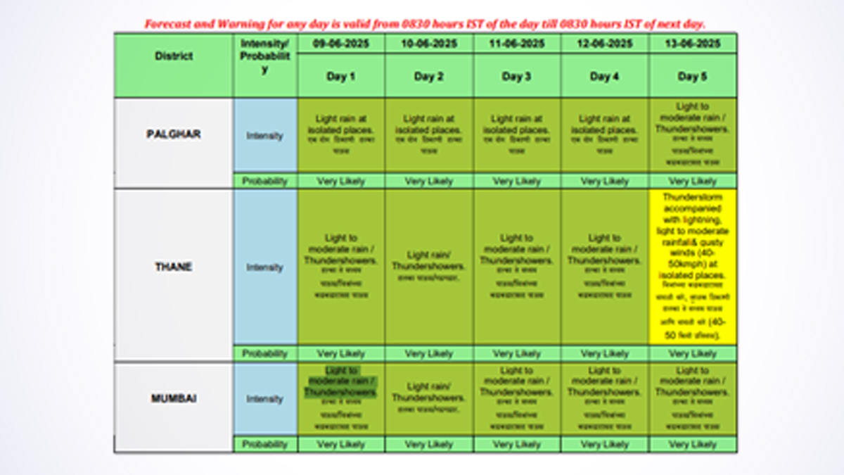 The India Meteorological Department (IMD) has issued a green alert for Mumbai for the next five days starting today, June 9. According to IMD, from June 9 to 13, Mumbai is likely to receive light to moderate rainfall with thundershowers. On the other hand, weather forecasting service Windy has projected zero rainfall for Mumbai until Wednesday, June 11. Today, the temperatures in Mumbai are expected to be up to 30 degrees Celsius. Weather Forecast Today, June 09: Check Weather Updates, Heatwave Warning, Rain Predictions for Mumbai, Delhi, Chennai, Bengaluru, Hyderabad, Shimla and Kolkata.