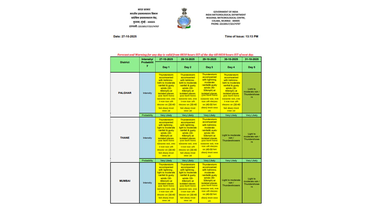 The India Meteorological Department (IMD) has issued a yellow alert for Mumbai, Palghar and Thane for today, October 28. The weather agency has predicted thunderstorms accompanied by lightning, light to moderate rainfall and gusty winds at isolated places in the above districts of Maharashtra on Tuesday. IMD has also issued a yellow alert for Mumbai, Thane and Palghar till Wednesday, October 29 and for Palghar till October 30. Weather Forecast Today, October 28: Check Weather Updates, Rain Predictions for Mumbai, Delhi, Chennai, Bengaluru, Hyderabad, Shimla and Kolkata.