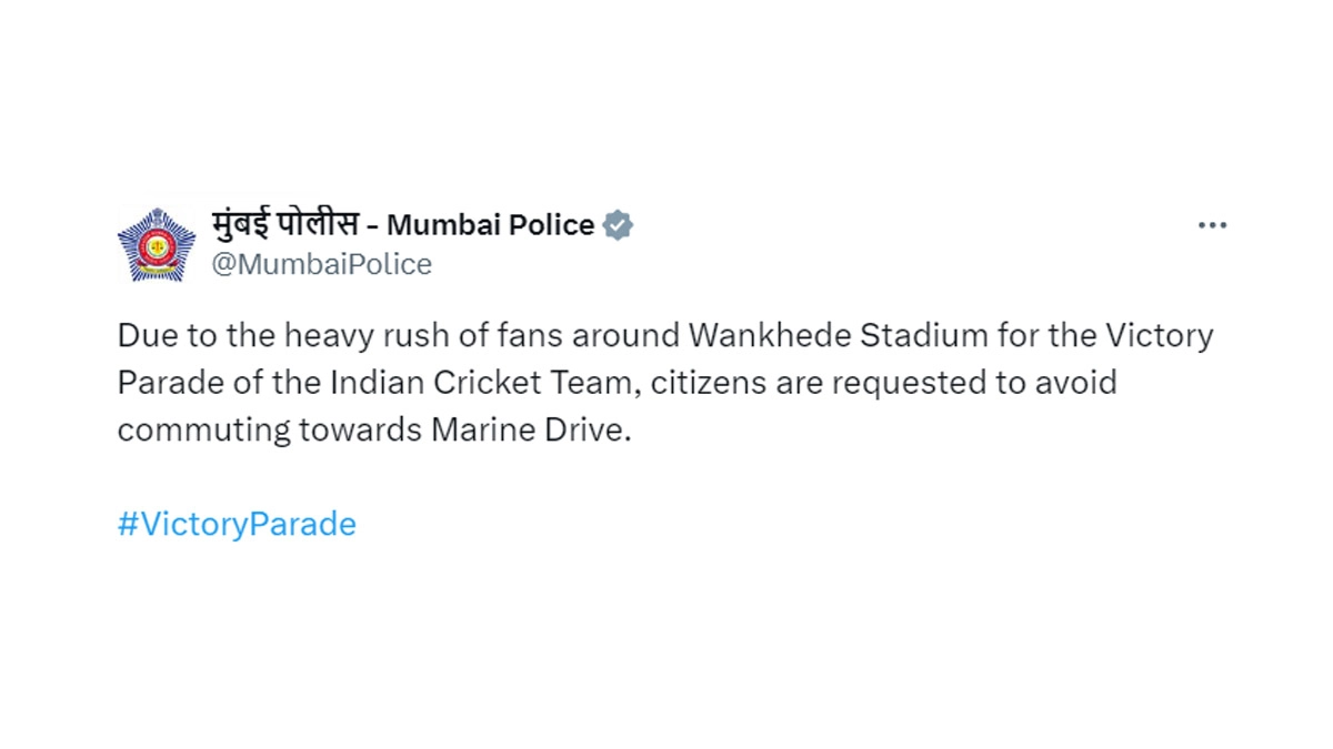 The Mumbai police have asked people to avoid commuting to Marine Drive as a sea of fans have gathered near the Wankhede Stadium for the Indian Cricket Team's Victory Parade. Taking to X (formerly Twitter), the Mumbai police shared a video and asked citizens to avoid travelling to Marine Drive. Meanwhile, the Men in Blue arrived in Mumbai and were greeted by fans at the airport. The victory parade is expected to begin soon. Mumbai: Fans Gathered at Marine Drive for Team India’s Victory Parade Make Way for Ambulance Ahead of Rohit Sharma’s T20 World Cup Winning Team’s Arrival (Watch Video).