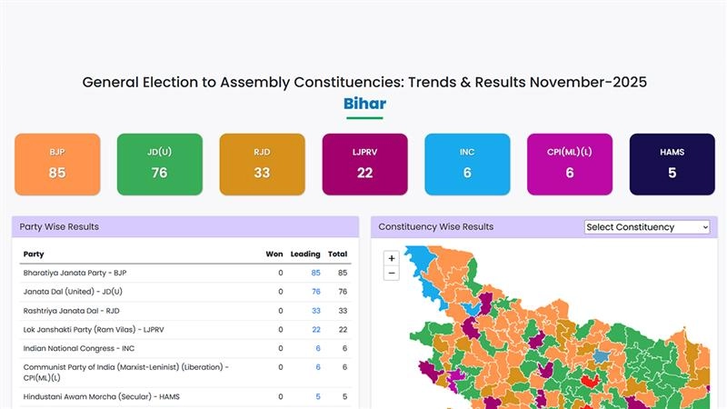 The Bihar Assembly Election Results 2025 are showing a decisive tilt toward the NDA as early trends released by the Election Commission at 12 AM put the alliance ahead on 191 of the 243 seats. The BJP is leading in 85 constituencies, followed by JDU with 76 and LJP(RV) with 22, while allies HAMS and RLM hold leads on five and three seats, respectively. In contrast, the Mahagathbandhan is trailing significantly with leads on just 48 seats, including 33 for RJD, six for Congress, six for CPI(ML)L, one for VIP, and two for CPI(M). The numbers signal early dominance by the BJP–JDU combine, marking a strong performance for the ruling bloc. Bihar Election Result 2025 Constituency-Wise Winners List: Seat-Wise List of Winning Candidates From BJP, RJD, JDU, Congress, AIMM and Other Parties in Bihar Assembly Elections.