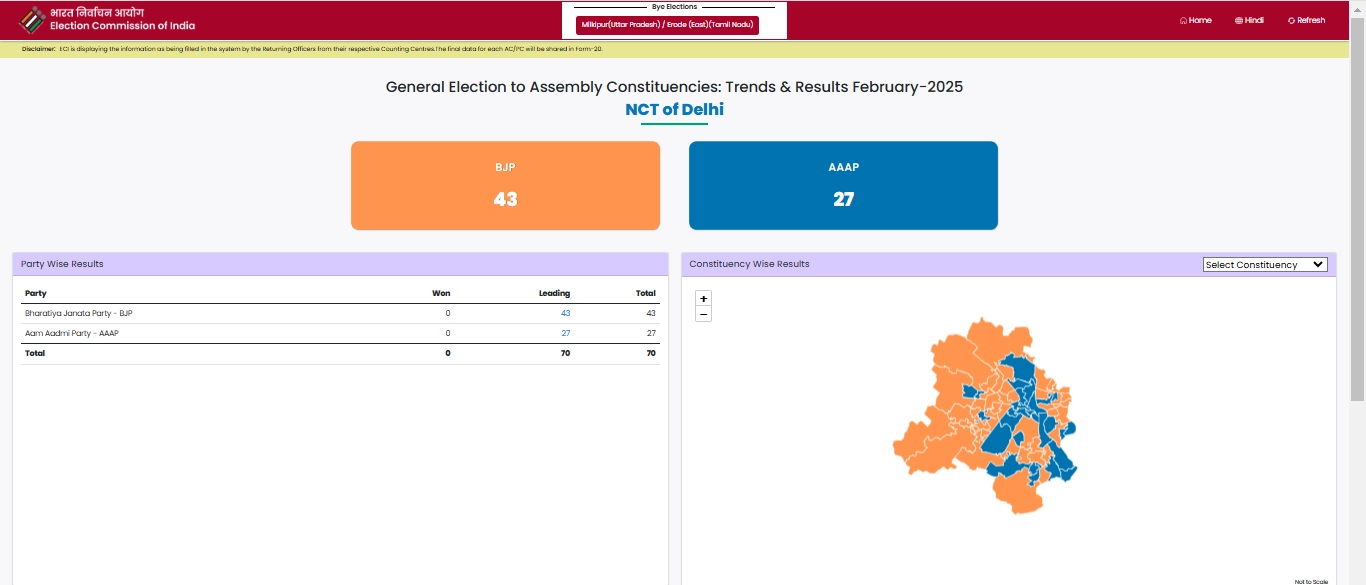 Congress is poised for another electoral setback and is on the way to hit a hat-trick of zero seats in Delhi, according to the latest counting trends by the Election Commission of India (ECI) website. As of the time of writing, the BJP is leading in 41 seats, while AAP is ahead in 29, with no sign of Congress making a significant impact in the Delhi assembly election 2025. The Delhi Assembly has 70 seats in total. Exit polls also indicate a third consecutive wipeout for Congress in the capital. Delhi Election Result 2025 Winners List: Constituency-Wise List of Winning Candidates From AAP, BJP, Congress and Other Parties in Delhi Assembly Elections.
