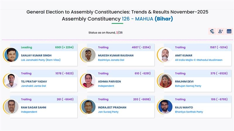 Vote counting in the Mahua Assembly constituency of Bihar has taken a dramatic turn in the 2025 elections, with Janshakti Janata Dal chief Tej Pratap Yadav slipping to fourth position in the second round of counting. LJP (Ram Vilas) candidate Sanjay Kumar Singh has surged ahead with 6,901 votes, leading by 1,409 votes, while RJD’s Mukesh Kumar Raushan trails in second place with 4,607 votes. AIMIM’s candidate holds the third position with 1,587 votes. Tej Pratap Yadav, who was third in the first round, has managed only 1,078 votes so far, marking a significant decline in his performance. As counting progresses, the attention is firmly on Yadav’s unexpected fall in his stronghold. Mokama Assembly Election Result 2025: JDU’s Anant Singh Takes Lead in Very Early Trends, RJD’s Veena Devi Trails in Bihar Vidhan Sabha Polls.