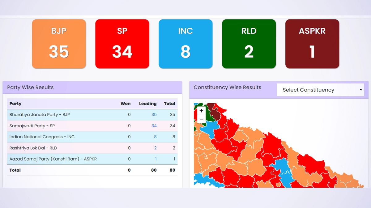 The results of the India General Elections 2024 will be announced today, June 4. The counting of votes for the 80-member Lok Sabha of Uttar Pradesh is underway. According to the latest trends by the Election Commission at 11 am, BJP is leading on 35 seats, Samajwadi Party on 34, Congress on 8 seats, RLD and ASPKR on two and one seat each respectively. As per initial trends, there is a close fight between the SP and BJP in Uttar Pradesh. Voting for the 80 Lok Sabha seats of Uttar Pradesh was held in seven phases from April 19 to June 1. Lok Sabha Elections 2024 Results Live News Updates: NDA Leads in 290 Seats, INDIA Bloc Ahead in 222.