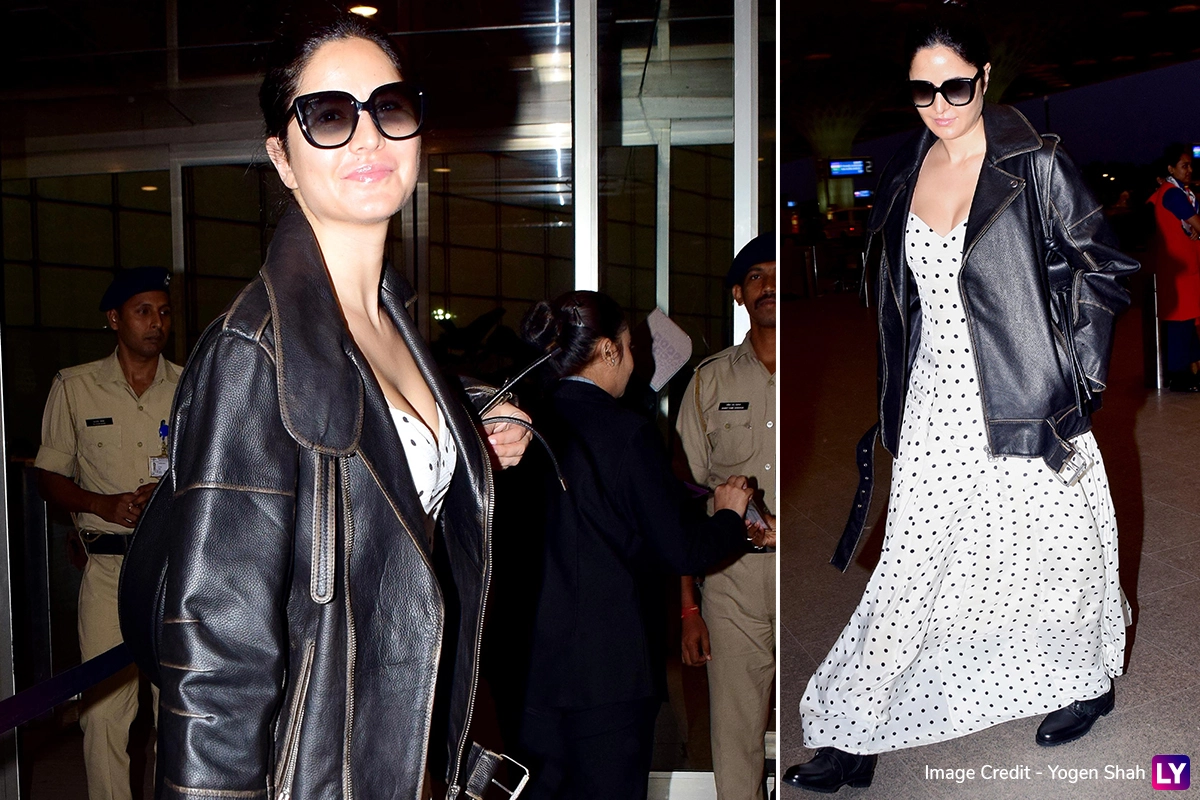 Katrina Kaif rocked her airport fashion style, as always. She looked stunning in a vintage-inspired polka-dotted maxi dress with a sweetheart neckline, paired perfectly with an oversized leather jacket. Completing her ensemble were black boots, a matching leather bag, and chic black sunglasses. She kept her jewellery and makeup minimal, opting for a natural look with just a touch of lip gloss. Her makeup was simple, and her hair was elegantly tied up in a neat updo, giving her a relaxed yet stylish vibe for her flight. From Minis to Midis and Maxis, All the Dresses that We'd Like to Steal From 'Merry Christmas' Actress Katrina Kaif's Wardrobe.