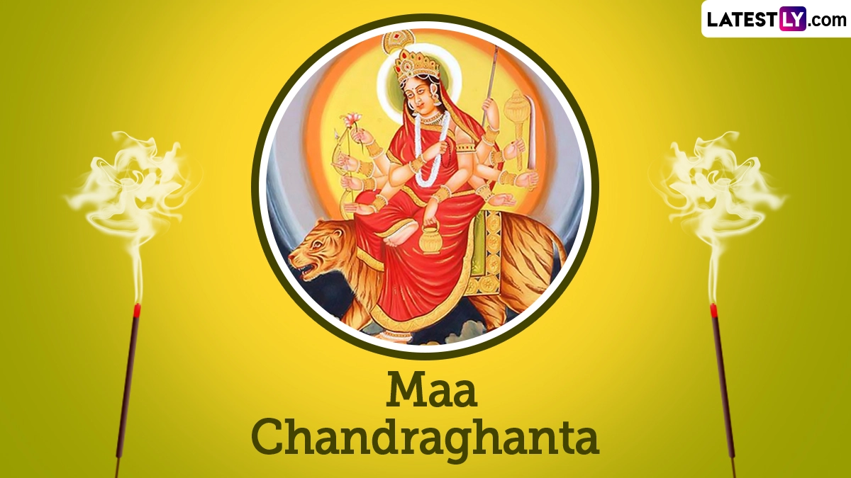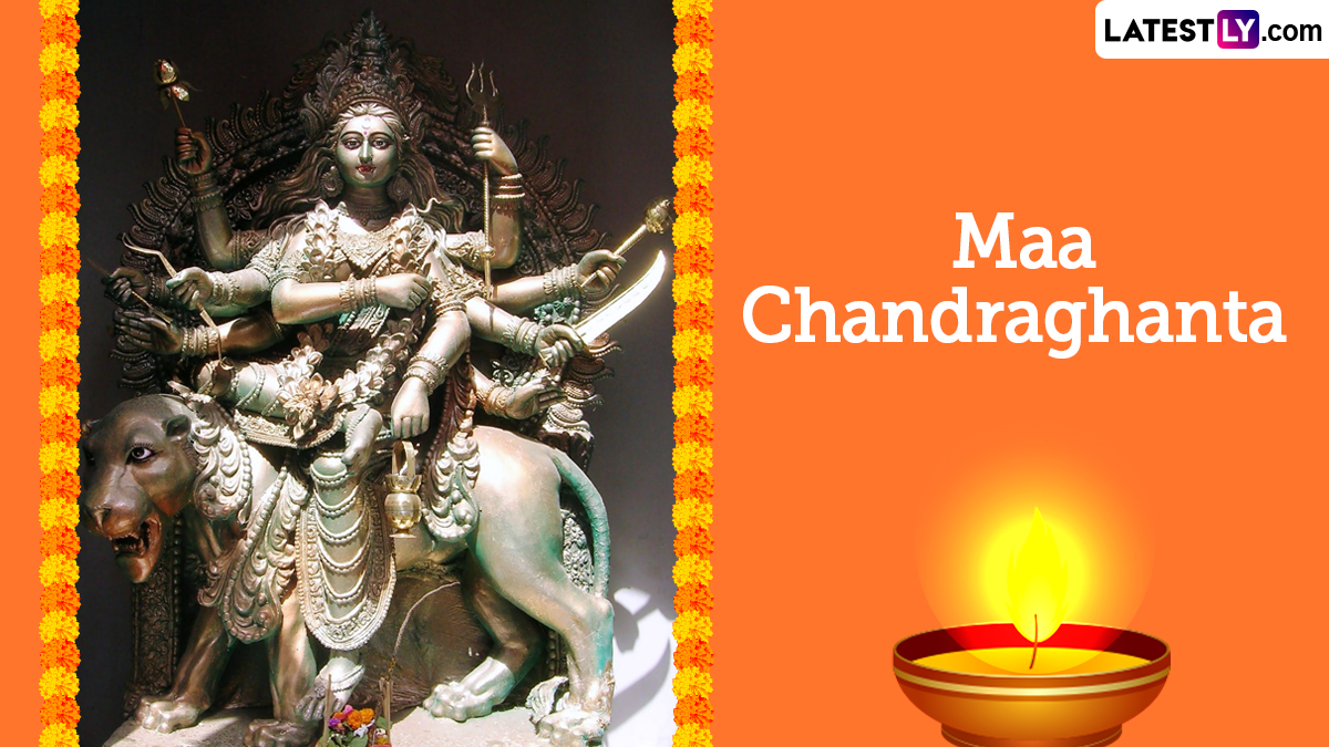 Chaitra Navratri has begun. The atmosphere is filled with a sense of excitement and devotion. Day 3 of the celebration, April 11, 2024, is dedicated to Goddess Chandraghanta. Symbolising both beauty and bravery, she emerges from a tigress, adorned with a crescent moon on her forehead, resembling a bell. She is portrayed in the colour red, as it is associated with vitality and courage. On this day, devotees awaken early, cleanse themselves, and offer prayers to her idol, adorned with traditional attire, yellow flowers, jasmine, panchamrit, and mishri, seeking her divine blessings for the journey ahead. To celebrate day 3 of Chaitra Navratri 2024, share Maa Chandraghanta images, pictures, photos, and posters with your near and dear ones. Chaitra Navratri 2024 Vrat Ka Khana (Fasting Food): 5 Vrat-Friendly Food Recipes From Sabudana Khichdi to Lauki Ki Kheer To Keep You Energised During Festivities.
