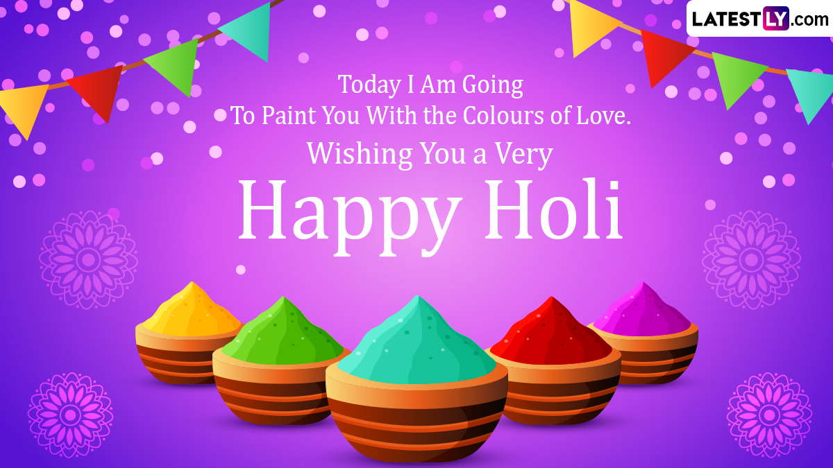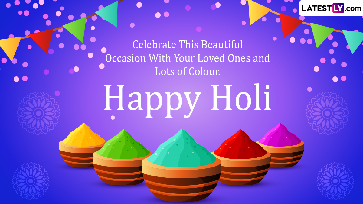 Holi, the dazzling festival of colours, marks the vibrant celebration of spring's arrival in India. It's a time when people unite, casting aside differences to embrace unity and love. Streets are filled with laughter, excitement, and music as folks indulge in playful battles with colourful powders, water guns, and balloons, splashing each other with shades of blue, green, red, yellow, and pink. This vibrant festival involves joyous rituals, delectable treats, and fun gatherings where families and friends dance, sing, and relish delicacies together. Holi symbolises the victory of good over evil and the rejuvenation of hope and happiness, endearing itself to millions worldwide as a cherished tradition. This year, mark your calendars for Holi 2024 on March 25. Join the fun celebrations by sharing these lively and colourful Happy Holi 2024 messages, wishes, greetings, images, wallpapers, and quotes. Let's spread the joy and paint the world with happiness! Holi 2024 Bhojpuri Songs' Playlist: Evergreen Songs by Pawan Singh, Khesari Lal Yadav and Others To Amp Up Your Holi Celebration (Watch Videos).