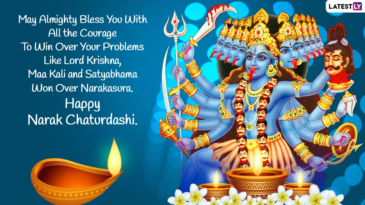 WhatsApp Message Reads: May Almighty Bless You With All the Courage To Win Over Your Problems Like Lord Krishna, Maa Kali and Satyabhama Won Over Narakasura. Happy Naraka Chaturdashi