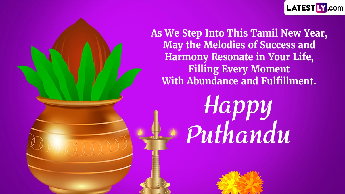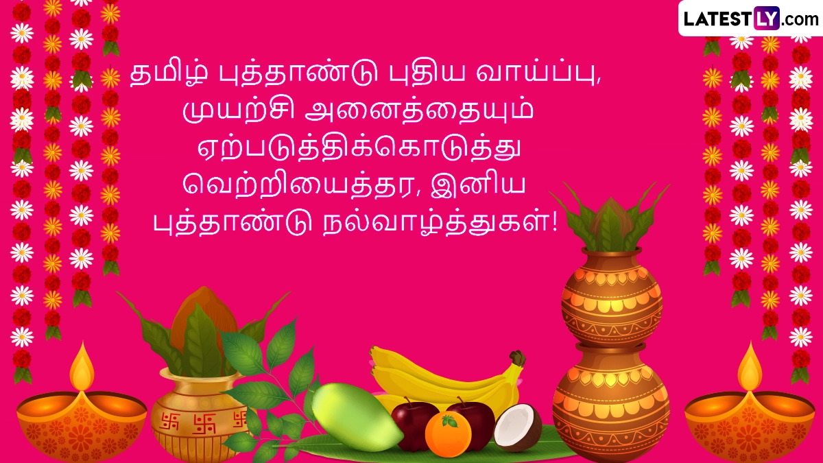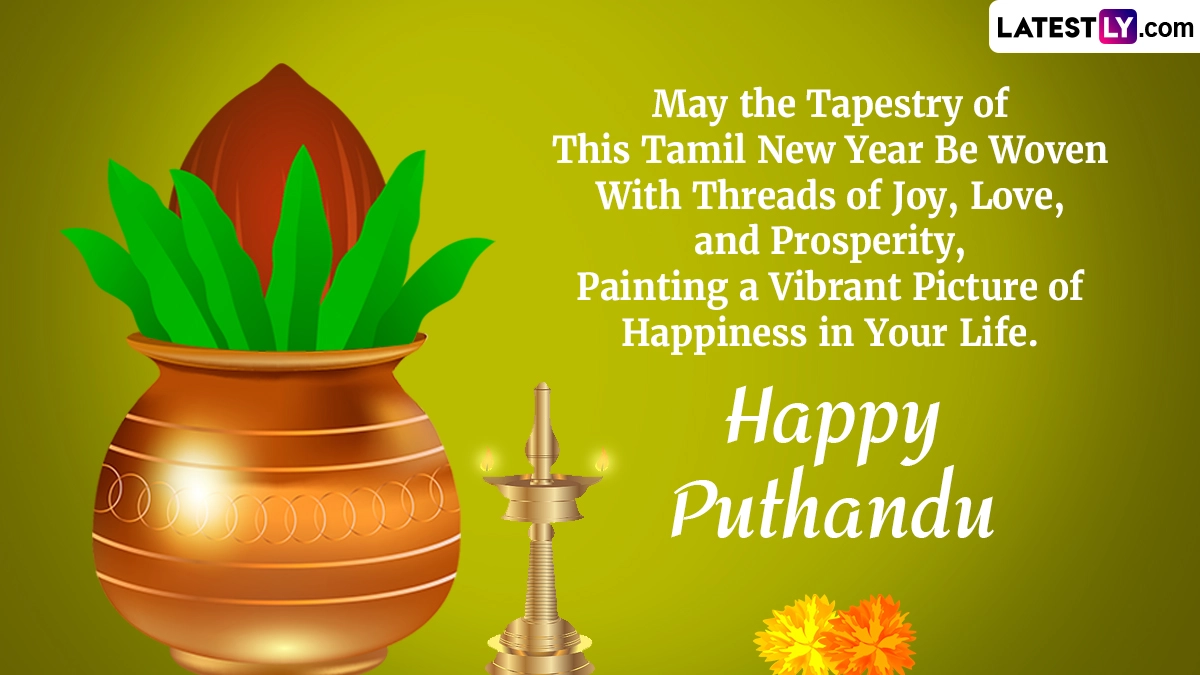 Puthandu is a special day that marks the Tamil New Year! It's a time to celebrate new beginnings, just like the start of spring. People in Tamil Nadu, Puducherry, Sri Lanka, and many other places come together to enjoy this happy occasion. This year, Puthandu falls on Sunday, April 14th. Families get ready by cleaning their homes and making beautiful Kolam designs on the floor. These colourful patterns welcome the New Year with good luck. People wear new clothes and greet each other with warm wishes, saying, ‘Puthandu Vazthukal!’ It's a day filled with joy and laughter as families and friends gather to celebrate. Share the happiness by sending Puthandu 2024 wishes, quotes, messages, images, and wallpapers of Puthandu Vazthukal in Tamil to your loved ones. Happy Puthandu 2024 Greetings and Puthandu Vazthukal Images: Send Wishes, Wallpapers and Quotes to Your Loved Ones To Celebrate the Tamil New Year.