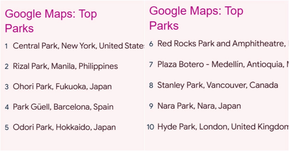 With searches running through Google every year, it results in a wide array of data showcasing information about how people live and what they are looking for. Every year, Google shares that information in a 'Year in Search', which breaks down popular search terms that come over the year globally, in different regions and countries. The Google Year in Search 2024 globally for Google Maps: Top Parks are Central Park in New York, Rizal Park in Manila, Odori Park in Hokkaido, Ohori Park in Fukuoka, and Park Guell in Barcelona, among others. Below, check out the top ten most searched parks on Google Maps for 2024. Google Year in Search 2024: Top 10 Food and Drink Recipes That Dominated Global Search.