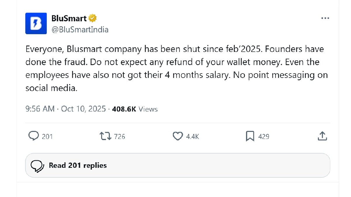 'BluSmart Shutdown' Post Made from Company Account on X