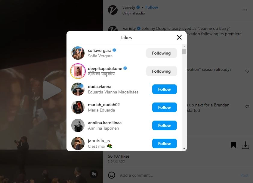 Bollywood superstar Deepika Padukone showed her appreciation towards Hollywood legend Johnny Depp by liking a video by Variety on Instagram. And this act by the 37-year-old actress has drawn mixed reactions on social media. Johnny Depp is making a return to the movie biz with the Maïwenn-directed French movie Jeanne du Barry, a year after successfully winning the court battle against his ex-wife and actress Amber Heard and, in the process proving to the world that he, a man too, was a victim of domestic violence. Johnny received a seven-minute standing ovation for his performance as Louis XV at the ongoing Cannes 2023 or the 76th Cannes Film Festival. A clip capturing Johnny Depp’s heartfelt expressions as he received much appreciation from his peers and fans was shared by Variety. The Indian actress on Instagram liked this video, and it has got everyone talking. Not only Deepika, Modern Family star Sofia Vergara too liked the clip. TW: Amber Heard Tells Johnny Depp ‘Suck My Dick’ in Triggering Video Clip Presented During Her Cross-Examination.