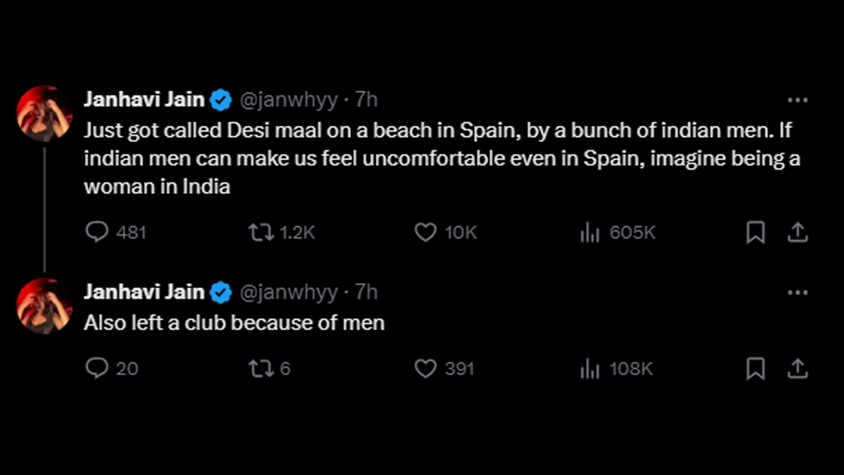 Another day, another sickening trend online that only deepens the gruesome reality that we otherwise face regularly. An X user, Janhavi Jain, shared her experience of eve teasing, accusing a group of Indian men who called her out while she was on a beach in Spain. "Just got called Desi maal on a beach in Spain, by a bunch of indian men. If indian men can make us feel uncomfortable even in Spain, imagine being a woman in India," she wrote on X. In another post, she added, "Also left a club because of men." Instead of empathising with her, social media users decided to mock her. A sick trend began appearing on X timelines, with women and men sharing fake stories of eve teasing to shame Indian men and women. The trend involves a replica of the original tweet shared by Janhavi, with a different city, both abroad and in India, followed by a series of mockery. The incident remains unverified, but should mockery be the response? She has deleted the tweet and made her X account private. It is important to note that this comes amid the nation's rally demanding justice for RG Kar Hospital's rape and murder case in Kolkata. These trends only divert the attention from real issues and problems that women face on a regular basis.