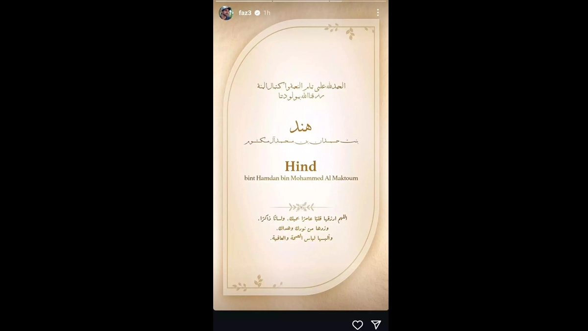 Dubai Crown Prince Sheikh Hamdan bin Mohammed bin Rashid Al Maktoum, popularly known as Fazza, welcomed his fourth child, a baby girl, on Saturday. He announced the birth on Instagram, revealing her name as Hind, in honor of his mother, Sheikha Hind bint Maktoum bin Juma Al Maktoum. The name Hind holds deep significance in Arabic culture, symbolizing strength, nobility, and prosperity. Historically, it referred to “a hundred camels,” signifying wealth. It has also been carried by notable figures like Hind bint Utbah, a key personality in early Islamic history. Sheikh Hamdan, Crown Prince of Dubai since 2008, is the son of Sheikh Mohammed bin Rashid Al Maktoum, Ruler of Dubai, and serves as UAE’s Deputy Prime Minister and Minister of Defence. Dubai Princess, Sheikha Mahra Who Dumped Husband on Social Media, Launches Perfume ‘Divorce’ in Viral Instagram Post (See Pic & Video).