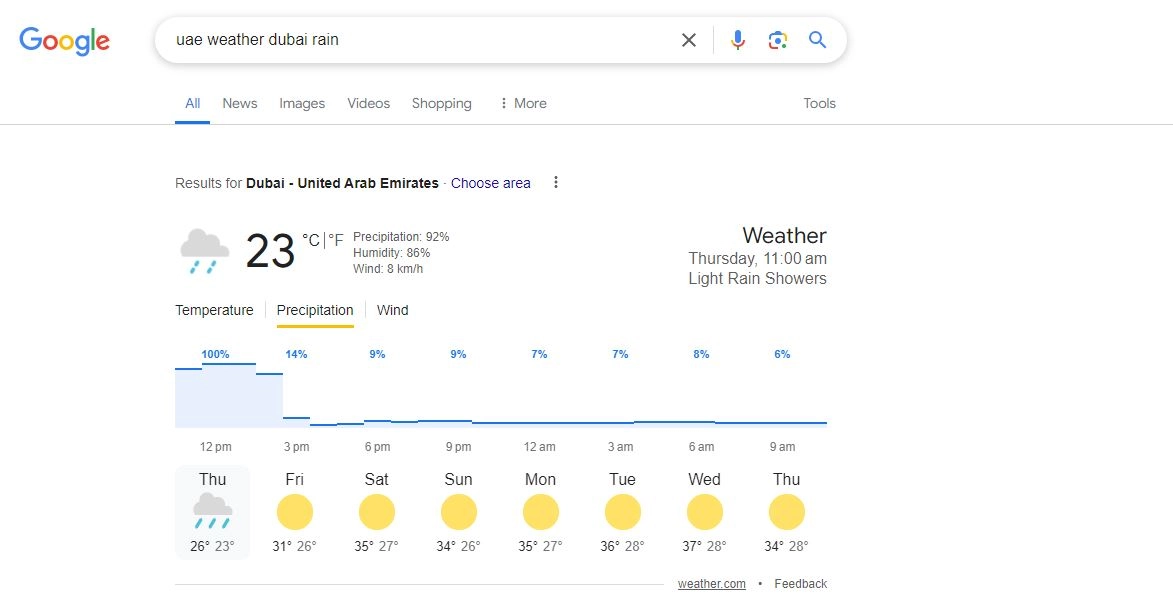 According to the Dubai weather forecast, it is raining in Dubai right now. At present, it's 23 degrees, with some clouds and rain. As per the weather report, the rain will continue until 3 pm, and there is a possibility of flooding in some areas. Netizens took to social media and shared videos of the rain in Dubai, which are spreading fast on social media. The UAE Weather Forecast says there will be more rain, thunderstorms, and lightning on Thursday. People on the internet are sharing their experiences of heavy rain as they go to the airport or work, warning everyone to stay safe. It looks like the rainy season in Dubai is here again!Ā Cloud Seeding FAQs: Is Dubai Doing Cloud Seeding? Why Is There Excessive Rainfall in the UAE? Here's All You Need To Know About It.