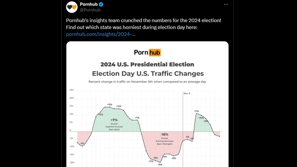 Election Day? More like Erection Day for the Americans! Pornhub searches surged across the United States of America on November 5 as voters took to X-rated entertainment amid their civic duty. Taking to X (formerly known as Twitter), Pornhub revealed the search surge among Americans, along with the horniest US state, on Election Day 2024. While Pornhub is banned in a few US states, South Carolina reportedly appeared the horniest on Election Day, with traffic 21 percent above average across the entire day. The state was closely followed by the District of Columbia, which saw viewership up by 18 percent. You can click here to get the detailed insight. Pornhub Plans To Block Its Adult Entertainment Services to 5 More States in US Over New Age Verification Laws.