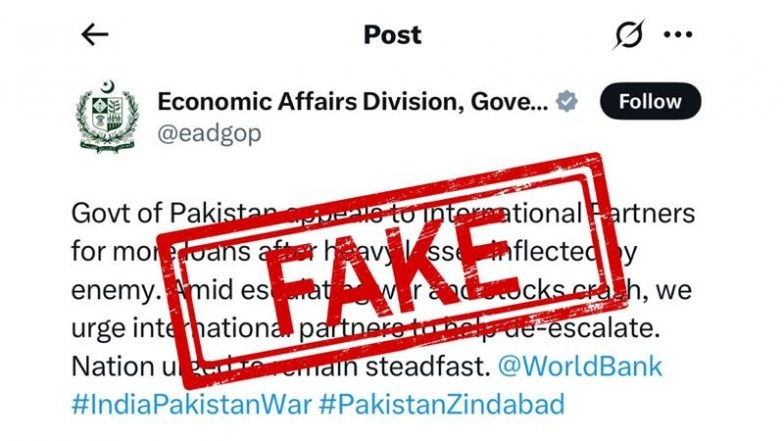 A tweet from Pakistan's Economic Affairs Division has gone viral, claiming the government appealed for more loans after suffering heavy losses from India's ongoing Operation Sindoor. The post, which mentioned escalating tensions, a stock market crash, and called on international partners to help de-escalate, was later deemed fake by Pakistan’s Ministry of Foreign Affairs. The government quickly stated that its X account had been hacked, dismissing the tweet as fraudulent. Meanwhile, India’s Press Information Bureau (PIB) shared a meme mocking the situation, further fueling the digital clash between the two nations. The controversy adds to the growing online rhetoric amid the escalating conflict between the two neighbouring countries. Fake News of Indian Forces Entering Pakistan, Suicide Attack on Army Brigade in Rajouri, India’s Strike on Karachi Port Surface on Mainstream Media Channels, Here’s a Fact Check of Viral Claims.