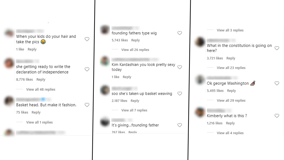 Kim Kardashian recently shared a string of photos on Instagram showing off a new hairstyle. In the pictures, she wore a light grey wig styled into basket-weave braids. While Kim may have likely aimed to make a fashion statement, the hairstyle reminded fans of the wigs worn by America's Founding Fathers in the 1700s. Kim Kardashian was roasted by her fans after the reality star posted photos of herself in the hairstyle. The wig was clearly the main focus of her look, as she went without makeup and wore simple nude leggings with a matching mesh tank top. Netflix Edits Out Kim Kardashian’s Booing Incident From The Greatest Roast of All Time Tom Brady Show.