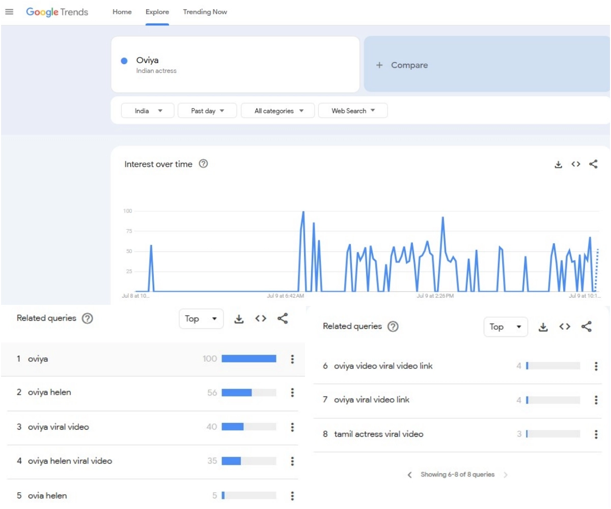The trending search term "Oviya Video Viral Video Link" and related keywords such as "Oviya Helen viral video," "Tamil actress viral video," and "Oviya viral video" on Google Trends have once again stirred online curiosity, but there seems to be no scandal behind it this time. The buzz appears to be centred around Oviya Helen’s latest Instagram reel, where the actress looks breathtaking in a strapless, shimmery black dress. With her chic short hair and a crimson red rose in hand, Oviya flirts effortlessly with the camera, exuding elegance and confidence. While the reel is a harmless, glamorous photoshoot, the viral nature of the phrase has misled many, especially as Oviya has previously been the target of "leaked MMS video" scandal and following baseless controversies. This time, however, it’s her style and poise taking the internet by storm. Oviya Helen Leaked MMS Video Controversy: ‘90ML’ Actress Alleges Ex-Boyfriend Released Morphed Clip To Defame Her After Break-Up – Reports.