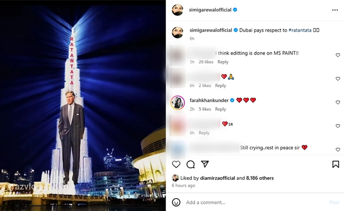Actress and talk show host Simi Garewal’s latest Instagram post has got the netizens talking. She posted a photo of the late Ratan Tata featured in Burj Khalifa. However, the photo is unverified and has been going viral on WhatsApp. The viral picture shows Dubai’s tallest building, featuring the businessman who passed away on October 9, 2024. While the country continues to mourn the demise of the Indian industrialist, the photo has sparked debate online. While some people called out Garewal, pointing out the “bad editing skills” on the viral image, others paid respect on the Instagram comment section. In addition, a quick scroll on Burj Khalifa's official Instagram handle shows no such photo. Ratan Tata Quotes and HD Images: Most Memorable and Profound Sayings by the Indian Business Icon That Will Inspire and Guide You for Life.