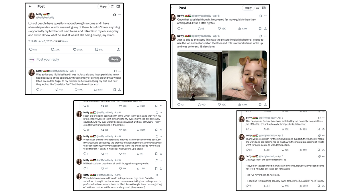 A woman who spent 18 days in a medically-induced coma has shared a detailed and eye-opening account of her experience, revealing the truth about what it feels like to be unconscious and whether she was aware of anything happening around her. Beffy, from South Wales, opened up about her unsettling journey through a viral post on X/Twitter, which has since racked up nearly 18 million views. The 30-year-old, who was diagnosed with Crohn's Disease in 2014, expressed a willingness to answer any questions people had about her coma experience. "I have no issue answering any questions about being in a coma," she wrote, offering insights into the reality of what she endured. Reflecting on the terrifying moments of her ordeal, Beffy recalled thinking she was going to die as her lungs began to fail, leading to her reintubation and a second medically-induced coma. Patient Declared in Coma Walks Out of Hospital in MP, Family Alleges Negligence and False Claims (Watch Video).