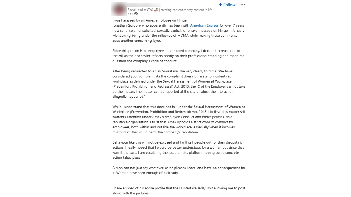 Recently, a woman came forward with a disturbing allegation against an American Express (Amex) employee named Jonathan Gordon, claiming that he sent unsolicited and offensive messages to her on the dating platform Hinge. The woman named Chhavi Joshi alleges that she was not only subjected to inappropriate messages but also felt unsupported by American Express's Human Resources (HR) department when she reported the incident. She wrote in a LinkedIn post, “Since this person is an employee at a reputed company, I decided to reach out to the HR as their behavior reflects poorly on their professional standing and made me question the company’s code of conduct.” This troubling situation has sparked a wider conversation about workplace conduct, company accountability and the ethical responsibilities of employees in the age of social media. LinkedIn New Feature Update: Microsoft-Owned Professional Networking Platform Launches New AI Feature for Job Seekers and Recruiters.