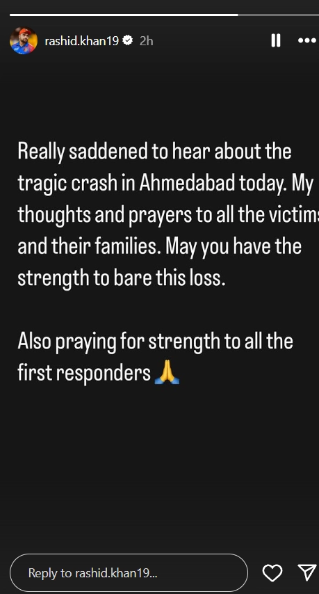 Afghanistan national cricket team star leg-spinner Rashid Khan expressed sorrow after the tragic Air India plane crash in Gujarat's Meghaninagar in Ahmedabad. The horrific incident occurred when an Air India flight carrying over 200 passengers to London crashed on June 12. After the tragic incident, Afghanistan's Rashid Khan shared a story on his Instagram handle where he shared his thoughts and prayers for all the affected families in the plane crash. Ahmedabad Plane Crash: Virat Kohli Reacts to Tragic Incident As Air India Flight Carrying Over 200 Passengers Crashes, Says ‘Praying for All Those Affected.’
