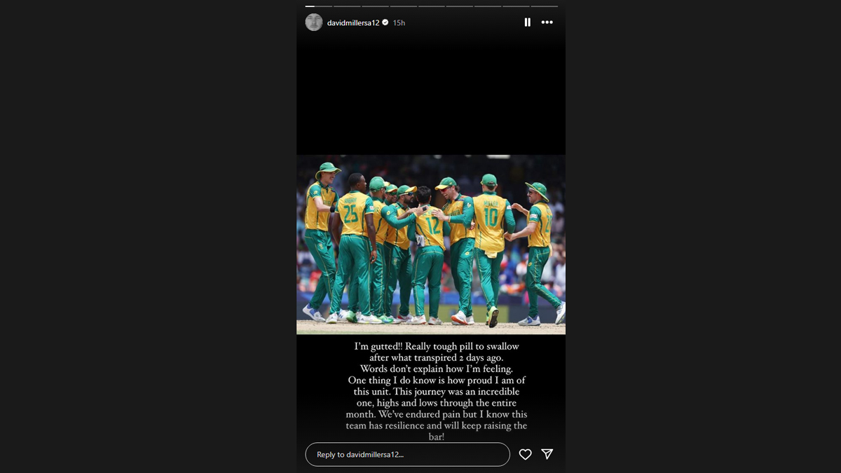 An Instagram story of David Miller has taken the internet by storm because there have been a lot of rumours here and there regarding the retirement of the South Africa National Cricket Team player. The rumours of Miller's retirement started coming in after South Africa's seven-run loss over India in the ICC Men's T20 World Cup 2024 final. This is Miller's first update after the loss against India in the T20 World Cup 2024 final. David Miller posted an image of the South Africa cricket team in which he also mentioned, "I'm gutted!! Really tough pill to swallow after what transpired 2 days ago. Words don't explain how I'm feeling. One thing I do know is how proud I am of this unit." Scroll down to have a look at the full Instagram story.Ā From Best Bowling Average to Most Boundaries, Take a Look at Records Broken at ICC T20 World Cup 2024.